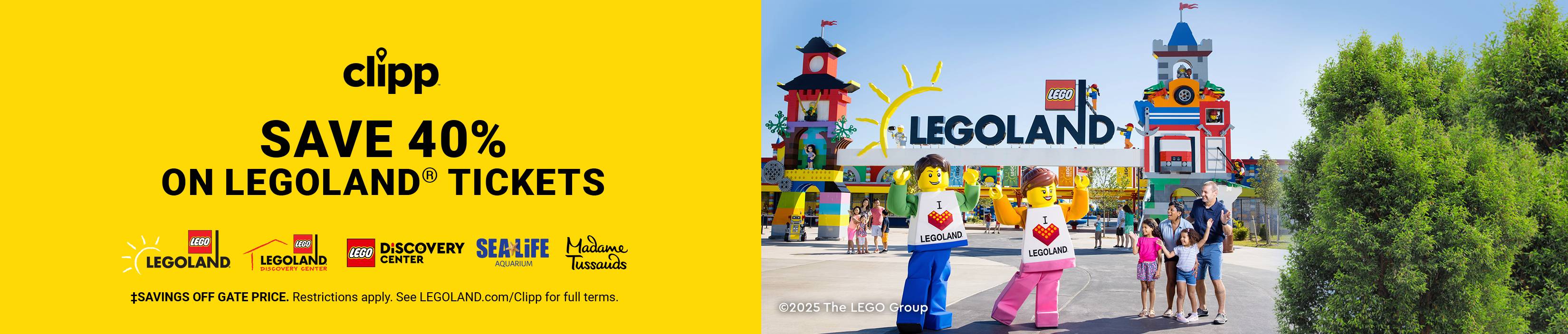 Looking for the ultimate LEGOLAND® promo? Clipp has teamed up with LEGOLAND to bring you unbeatable deals at their top resort and attraction destinations across the United States! Save 40% off the gate price on tickets to LEGOLAND California, LEGOLAND Florida, LEGOLAND New York, LEGOLAND Discovery Centers, LEGO® Discovery Centers, SEA LIFE Aquariums, and Madame Tussauds attractions nationwide.